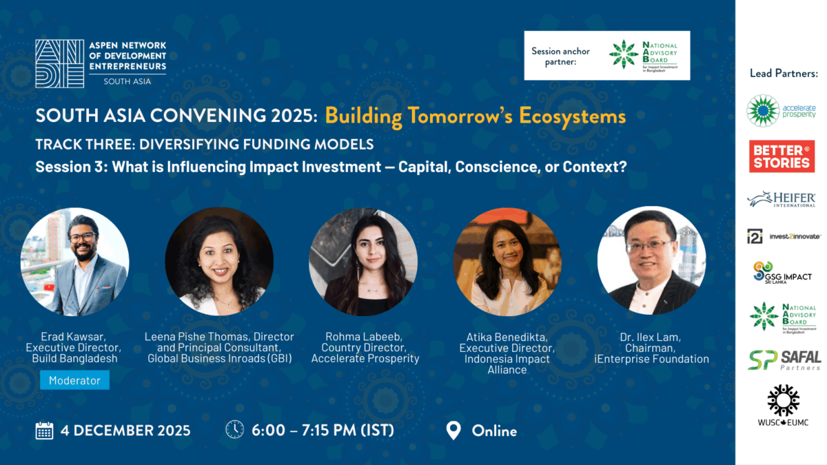 Impact Investment has become one of the defining trends of the 21st-century finance landscape—aligning profit with purpose and driving inclusive growth across South Asia. From blended finance to catalytic philanthropy, diversified funding models are reshaping how capital flows to social and environmental enterprises. But the key question for this year’s ANDE South-Asia Convening is not just how impact investment is influencing funding trends— the core discussion question is:
