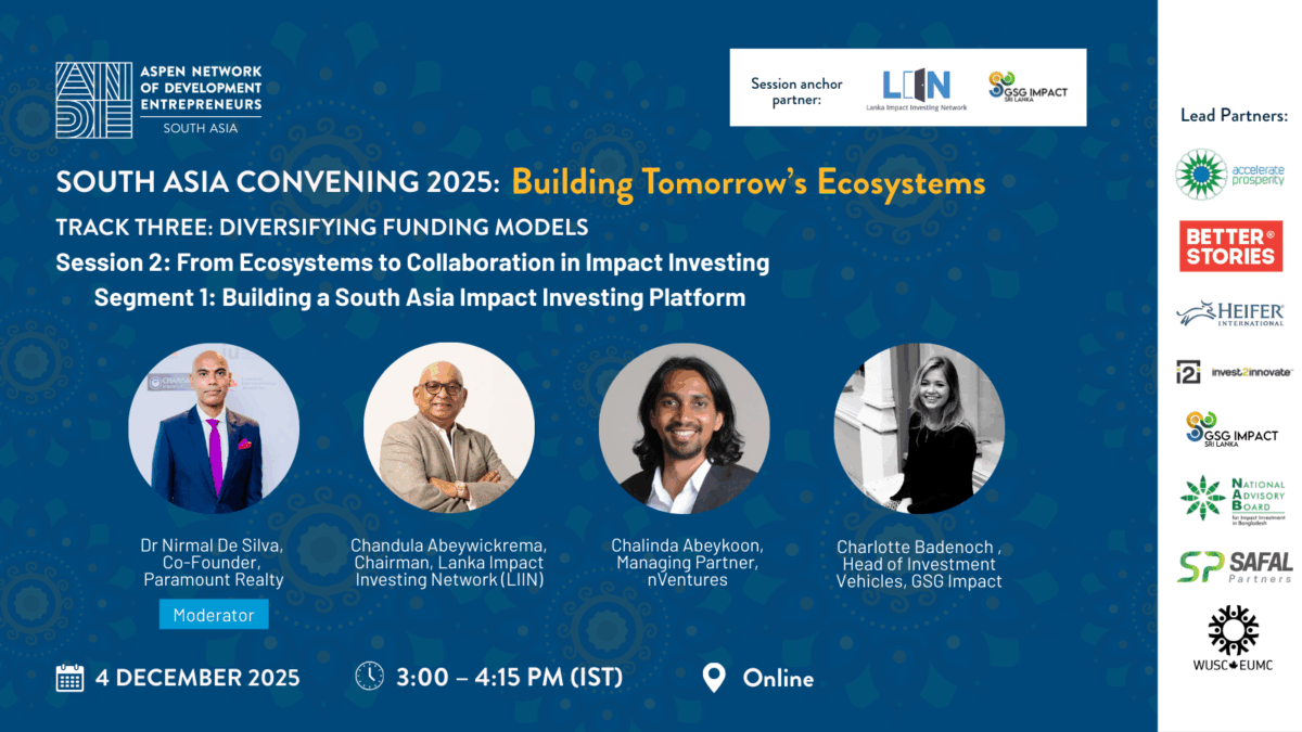 Time: 3:00 – 4:15 PM (IST) | Segment 1: Building a South Asia Impact Investing Platform (Anchored & Designed by Lanka Impact Investing Network and GSG Impact Sri Lanka)