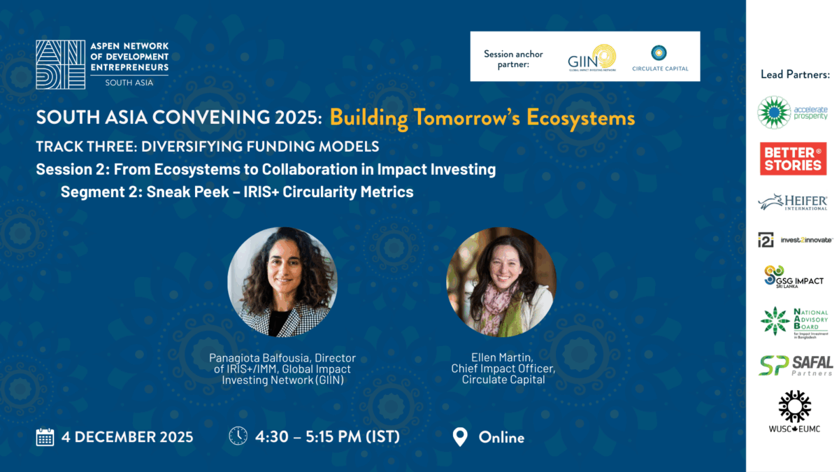 Time: 4:30 – 5:15 PM (IST) | Segment 2: Sneak Peek – IRIS+ Circularity Metrics (Anchored & Designed by Global Impact Investing Network (GIIN) and Circulate Capital)